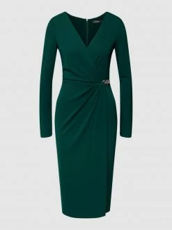 Das knielange Kleid von Lauren Ralph Lauren ist aus einem Material-Mix mit Stretch-Anteil gefertigt und tailliert geschnitten. Es kommt in Wickel-Optik mit Zier-Applikation und Rundhalsausschnitt.